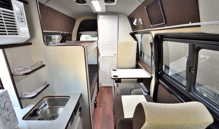 この価格帯のモデルでは、ナローやワイドボディをベースにした比較的コンパクトなレイアウトが中心で、都市部での取り回しや駐車のしやすさも重視されています。家庭用エアコンや大容量電装システムは省かれることも多いですが、シンク、冷蔵庫、電子レンジなど日常的な車中泊に十分な設備はしっかり揃っています。
