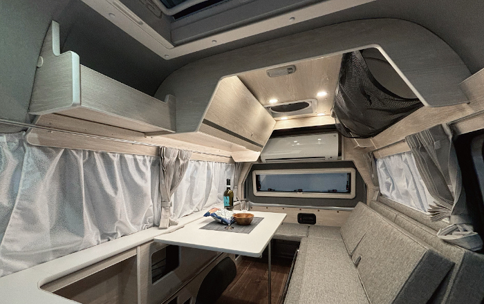 12Vクーラーと200Ahリチウムを搭載し、停車中でも快適な冷房を実現。エレベーティングルーフ仕様では最大8名が就寝できる大空間モデル。 - ナッツRV「LeekⅢ EVOLITE」(764〜845万円)