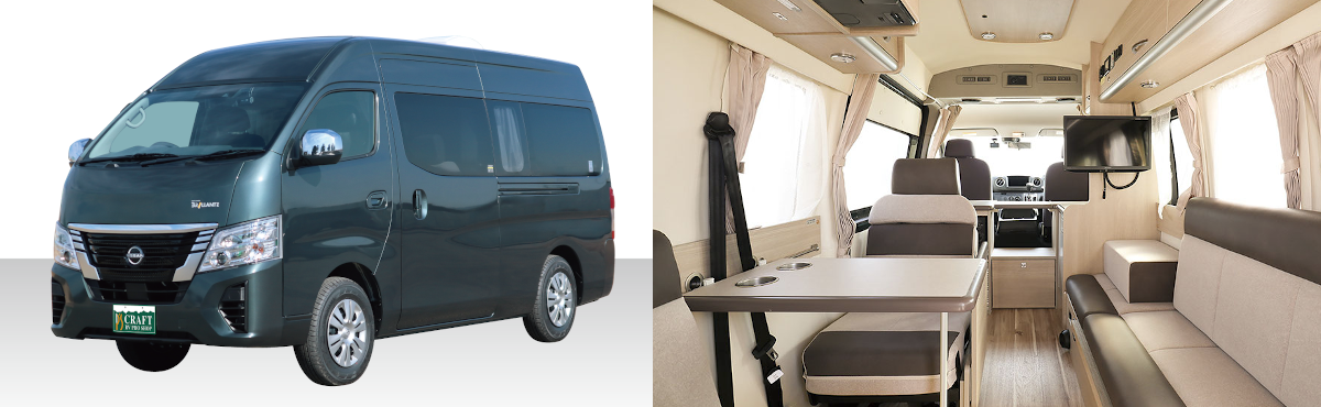 日産東京販売直営のキャンピングカープロショップ日産ピーズフィールドクラフトが手掛けるBRILLANTE(ブリランテ)」は、日産キャラバンをベース車両としたキャンピングカーモデルです。日産キャラバン(標準幅スーパーロング・ハイルーフ)をベースとした「BRILLANTE」は、家庭用エアコンや300 Ahリチウムイオンバッテリー、ソーラーパネル、電子レンジ、FFヒーターなどを標準装備し、豪華な居住空間を提供します。広く開放的な後部マルチルームを備え、収納性と快適性に優れており、オフィス車としても集中作業や小規模ミーティングに対応可能な移動拠点となる設計です。