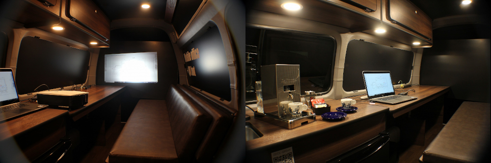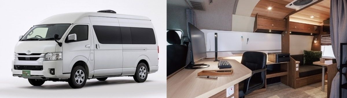 軽バンのホンダ N-VANやミニバンの日産 NV200をベースに、デスクや収納、サブバッテリー電源を組み込んだ移動オフィス仕様です。外回りの合間に作業スペースとして使えるほか、カーテンや照明も備えており、ちょっとした打ち合わせや休憩スペースにも最適。小型で扱いやすいため、個人事業主や小規模オフィスのモバイルワークにも向いています。・公式ページ