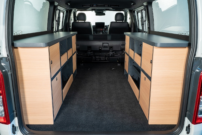 ハイエースをベース車両とし、様々なパーツを組み合わせることで自分好みの空間にできるキャンピングカーです。荷室部分の壁面に装着する「ベースボード」に、棚、ベッドマット、フロアボード、シンクユニット、ポータブル電源マウントボードなどの「ベースユニット」を組み合わせて空間を作り上げていきます。ベースボードの取り付けには販売店での加工が必要ですが、その他のアタッチメントは工具不要で取り付け可能です。これにより、アウトドアからテレワークまで、シーンに合わせて自分たちで組み換えができるのが魅力です。
