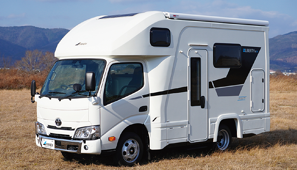 トヨタ・カムロードをベースにしたコンパクトキャブコン。全長5m未満ながら常設ダイネットとベッドスペースを備え、電源システムも充実。 - ナッツRV クレア 5.0