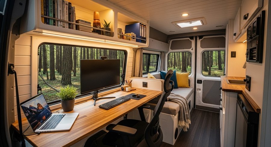 キャンピングカーをテレワークに活用するためには、快適に仕事を進めるための適切な設備を整えることが不可欠です。自宅で集中して仕事ができる環境を整えづらい場合でも、キャンピングカーは自分だけの個室空間を提供することで、周囲を気にせず仕事に没頭できる環境を作り出すことができます。このようなプライベート空間で作業効率を高めるためには、PCやその他の機器を安定して使用できる環境が必要となります。