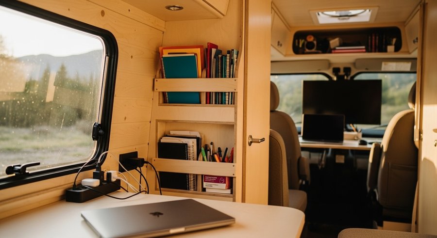 快適に仕事をするためには、自分に合ったサイズのデスク(テーブル)と、長時間の作業に耐えうる適切な椅子が重要です。多くのキャンピングカーには、食事や休憩に使うダイネットと呼ばれるテーブルとシートのセットが標準装備されており、これをワーキングスペースとして利用できます。より快適なパソコン作業を望む場合は、可動式の補助テーブルやパソコンの角度を調節するアイテムの追加が有効です。また、壁に取り付けるタイプや折りたたみ式のデスクなど、様々な形状があるため、自身のワークスタイルに合わせて選ぶことができます。