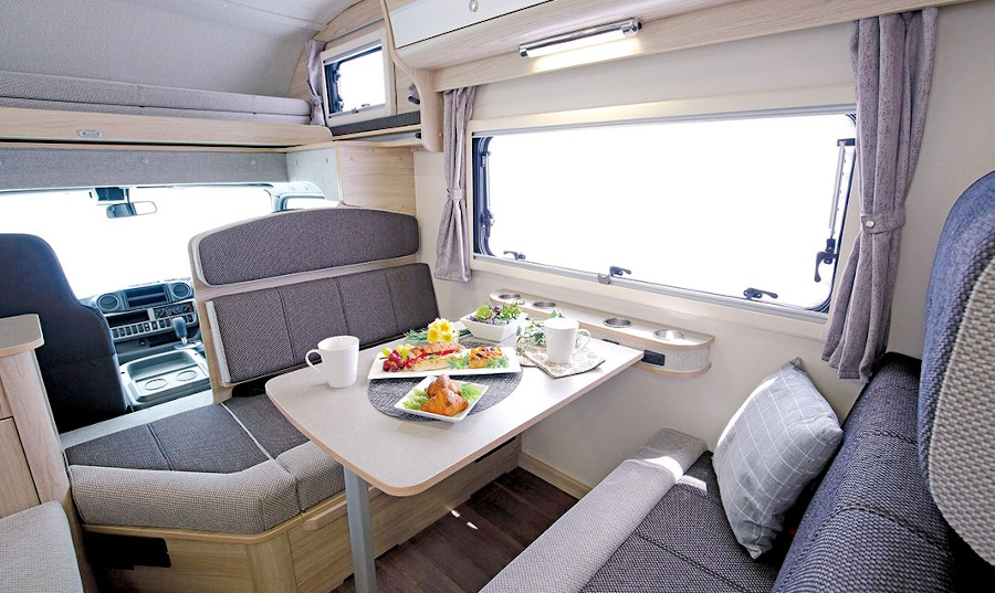 軽自動車をベースにしており、取り回しがしやすく燃費が良いのが特徴です。就寝やくつろぎスペースが中心で、大人2名でも手狭に感じる場合があります。