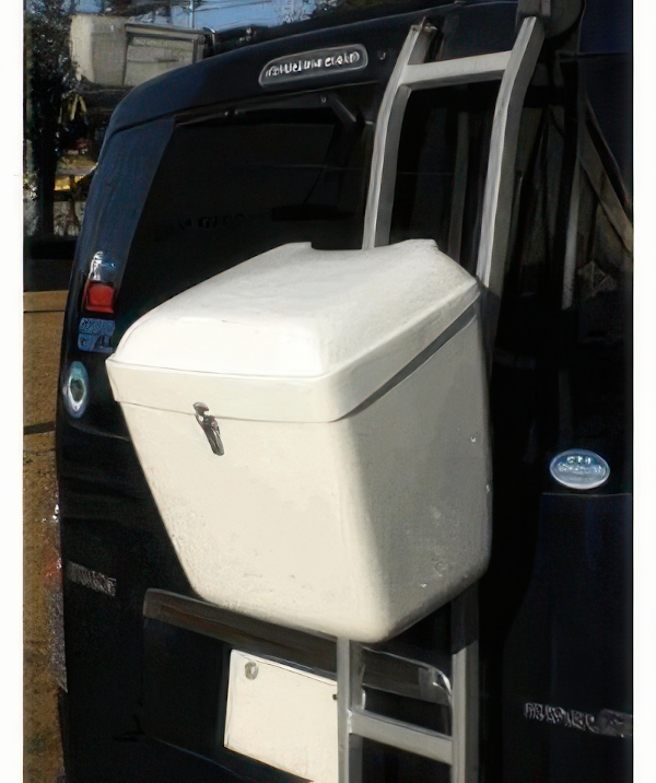日本製のしっかりとした作りのハードケースタイプのリアボックス。40Lの容量で、ごみだけでなくちょっとした荷物や折りたたみチェアなども収納可能。車のリアラダーに吊り下げて使える設計で、デザインもシンプルでスマートです。荷物を守るしっかりしたボディは、雨や泥の侵入を防ぎます。