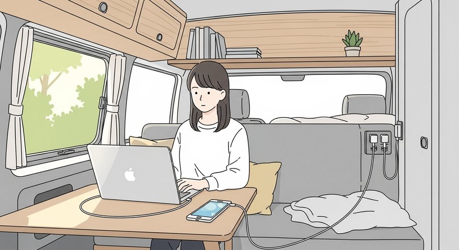 - 電源の確保: モバイルWi-Fiルーターやテザリングはバッテリー駆動のため、長時間の利用には充電器やポータブルバッテリーが必須です。停車中に利用する場合は、サブバッテリーからの電力供給が必要です。