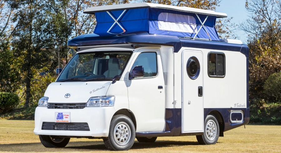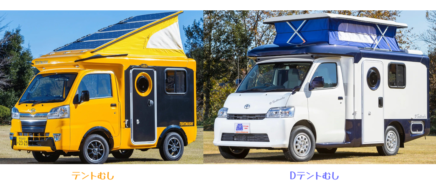 「Dテントむし」は、トヨタのタウンエーストラックまたはダイハツのグランマックストラックをベースとした普通車サイズのキャンピングカーです。