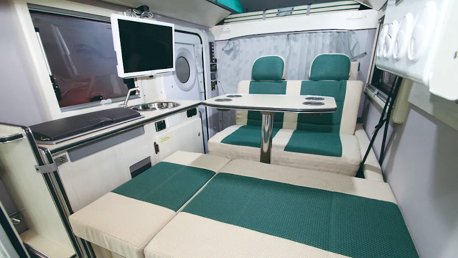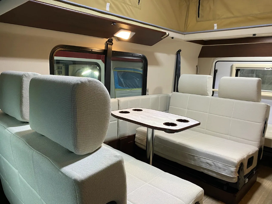 2024年に発表されたF1タイプは、SタイプとFタイプの「いいとこどり」をした新しいレイアウトです。セカンドシートには1人用のFASPシートが採用されており、移動中は前向き乗車が可能であると同時に、Sタイプのようにシート下を収納として活用できる高い収納力を持ち合わせています。このタイプは3名乗車定員ですが、就寝定員はフロアベッドで2名、ポップアップルーフのルーフベッドで2名の合計最大4名就寝が可能となっており、小さなお子様がいる場合にも対応できます。単座シートを後ろ向きにして補助マットと組み合わせることで対面式ダイネットになり、さらに補助マットを敷き詰めて掘りごたつ風にするなど、多彩なシートレイアウトが楽しめます。車中泊だけでなく、テレワークなどのビジネスシーンにも対応する柔軟性も持ち合わせています。登録ナンバーは8ナンバーです。