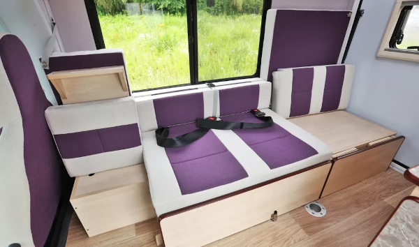 Fタイプは、イタリア製のFASPシートを採用しており、セカンドシートの向きを前向きにも後ろ向きにも変更できる柔軟性が魅力です。これにより、停車時には対面式のダイネットレイアウトを組むことが可能となり、車内での団らんや食事に適しています。このタイプは3〜4名での乗車に適しており、セカンドシートには3点式シートベルトと2点式シートベルトが装備されています。登録ナンバーは8ナンバーです。ベッド展開時にはSタイプと同様の広々としたベッドスペースが確保されます。
