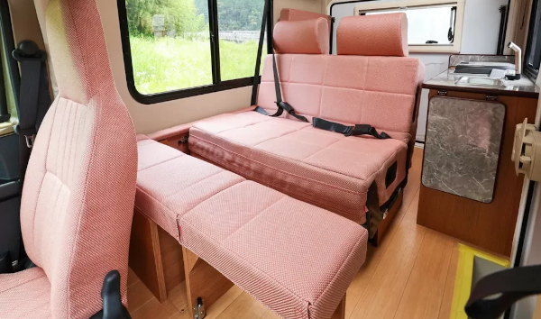 - Sタイプ(標準座席): セカンドシートが横向きのソファ兼収納スペースとなり、走行時も横向きです。1~2人での使用に適しています。