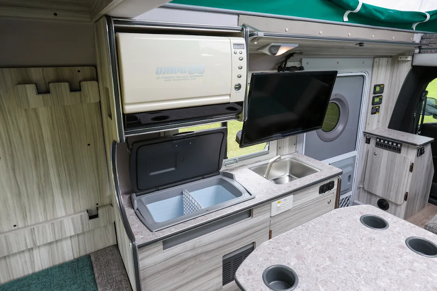キッチンエリアには必要不可欠な設備が凝縮されています。標準装備のギャレーにはミニシンクと、それぞれ10リットルの給排水タンク、そして電動ポンプが組み込まれています。冷蔵庫は18リットル容量で、冷却可能温度は+10℃から-18℃まで対応し、上部にはテーブルとしても利用できるスペースが設けられています。一部の仕様では、カセットコンロも標準装備として含まれます。