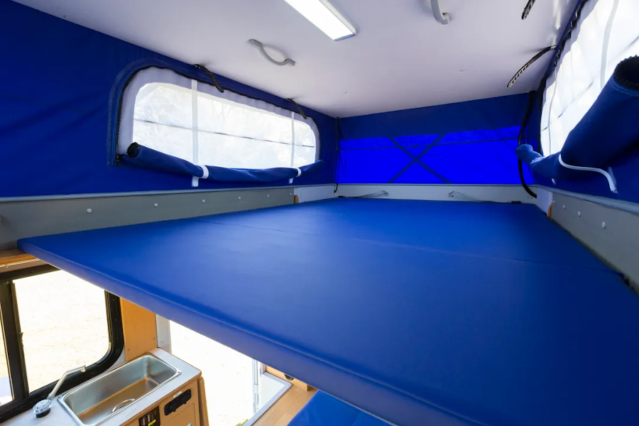 特徴的な外観の一部でもあるポップアップルーフは標準装備されており、ナイロンテント生地と大型網窓が備わっていて、車内の開放感と通気性を高めます。居住空間には、明るいメインLED照明が1か所、そして落ち着いた雰囲気の壁灯が1か所設置されています。就寝時には、ポップアップルーフを活用した二段ベッドが展開可能で、大人4名(小さなお子様がいる場合、合計5〜6名)の就寝に対応します。また、後部には脱着式のアルミフレーム製簡易ベッドも備えられています。食事や作業に便利な脱着式テーブルも用意されており、カップホルダー付きで、ベッド展開時には取り外すことができます。座席としては、運転席と助手席にはハイゼットジャンボエクストラ純正のリクライニングシートが採用されています。さらに、フロントキャビンと後部の居室は背抜き加工により一体となっており、広々とした空間を演出しています。