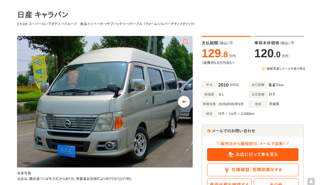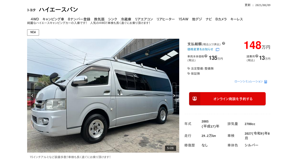 平成18年(2006年)前後の初期型であれば、150万円台(159万円から179万円程度)で購入できる可能性があります。走行距離は10万kmを超えることが多いですが、対面シートや段違いの2段ベッド、荷物スペースなど、人が乗れて寝られる使いやすいレイアウトが特徴です。FFヒーターが付いていればさらに良い条件とされます。